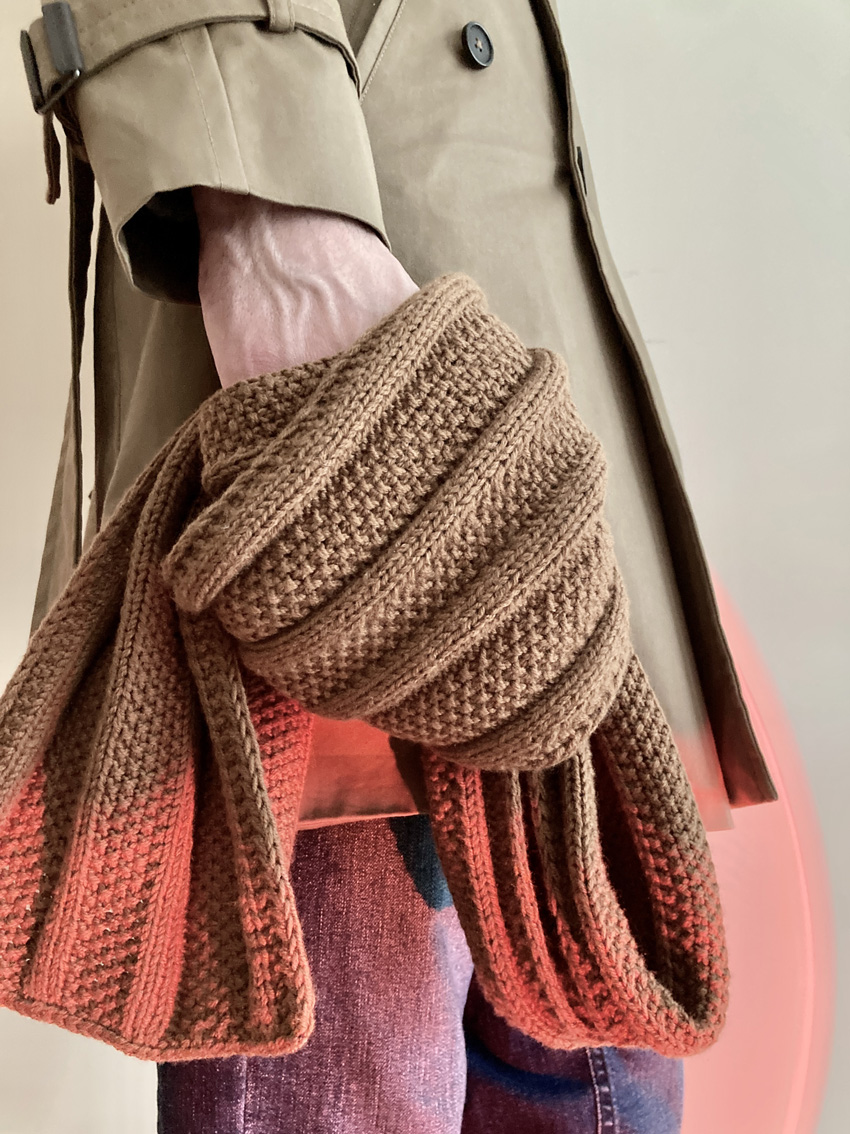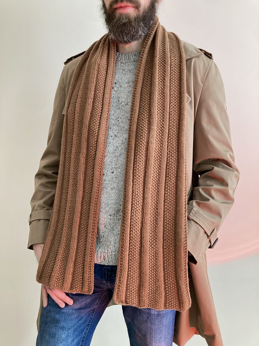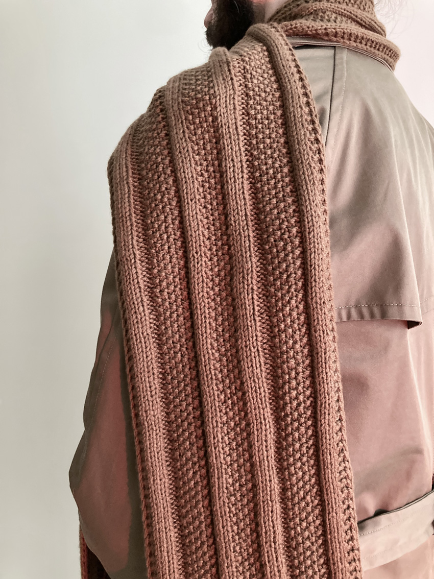 Horizon Szal to mięsisty, dwustronny szal dziergany na płasko podwójną nitką wełny merino. Jest miękki i ciepły — doskonale otula szyję. Wzór opiera się wyłącznie na oczkach prawych i lewych. Ma wyraźną, przestrzenną strukturę, a jednocześnie jest prosty w przerabianiu.