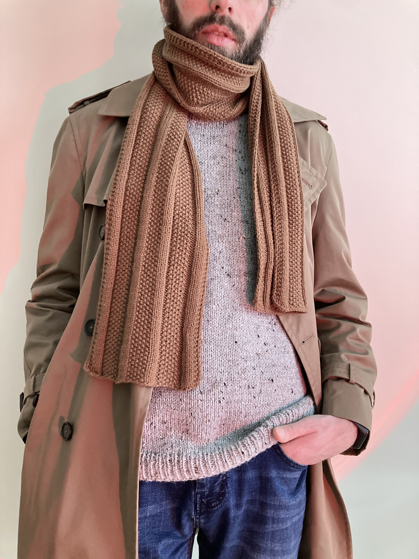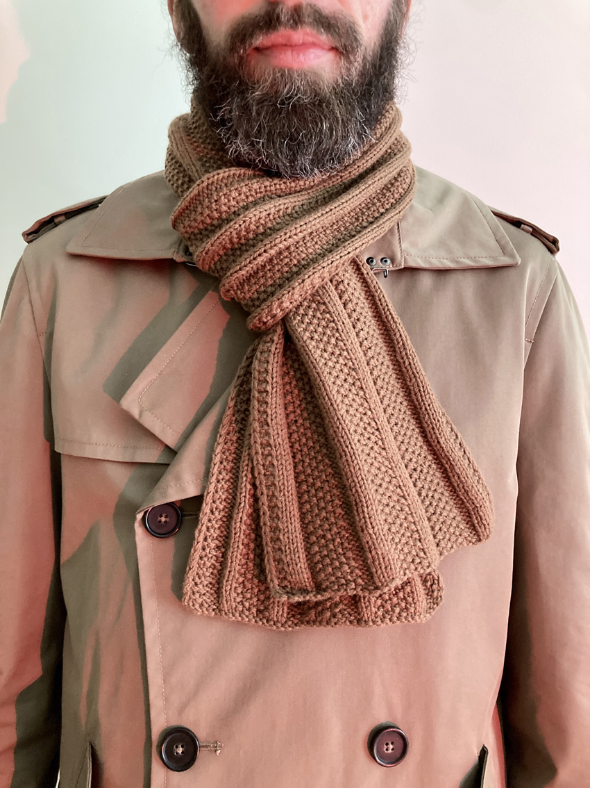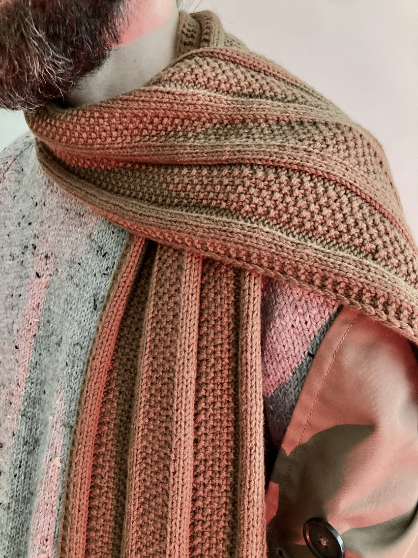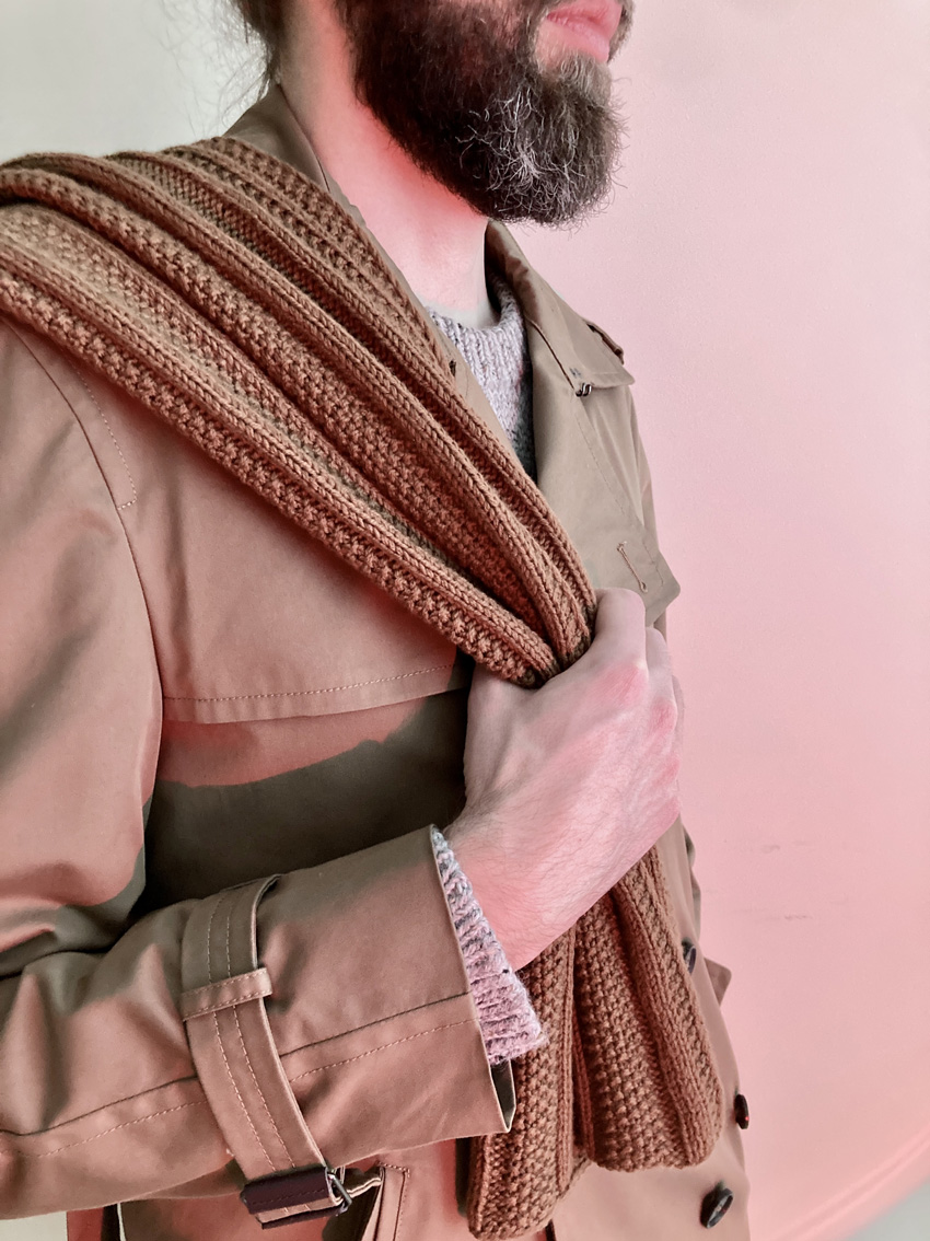 Horizon Szal to mięsisty, dwustronny szal dziergany na płasko podwójną nitką wełny merino. Jest miękki i ciepły — doskonale otula szyję. Wzór opiera się wyłącznie na oczkach prawych i lewych. Ma wyraźną, przestrzenną strukturę, a jednocześnie jest prosty w przerabianiu.